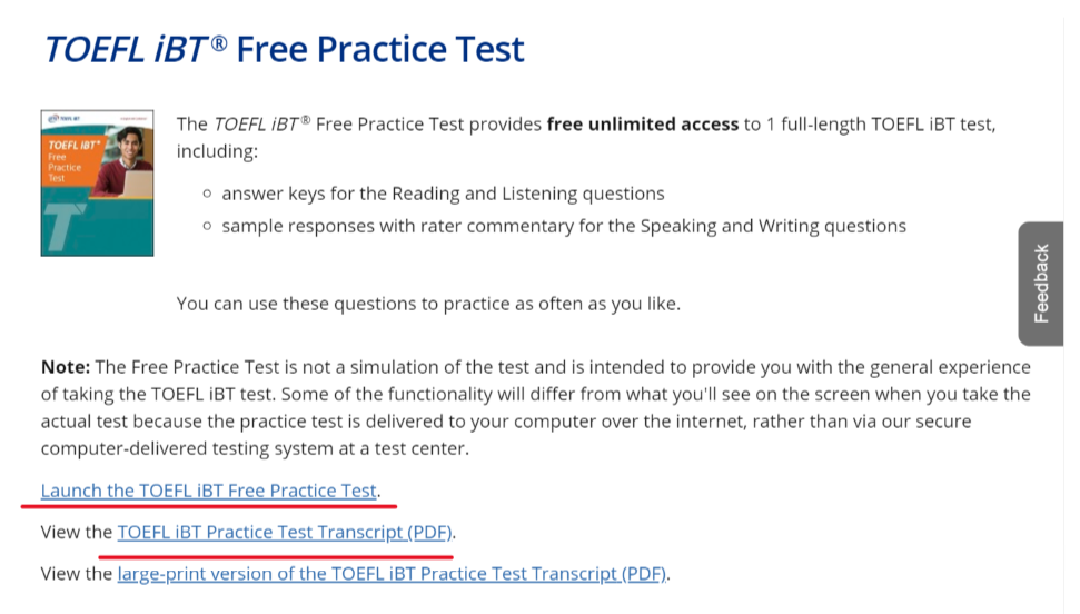 The TOEFL iBT® Free Practice Test provides free unlimited access to 1 full-length TOEFL iBT test, including: answer keys for the Reading and Listening questions sample responses with rater commentary for the Speaking and Writing questions You can use these
